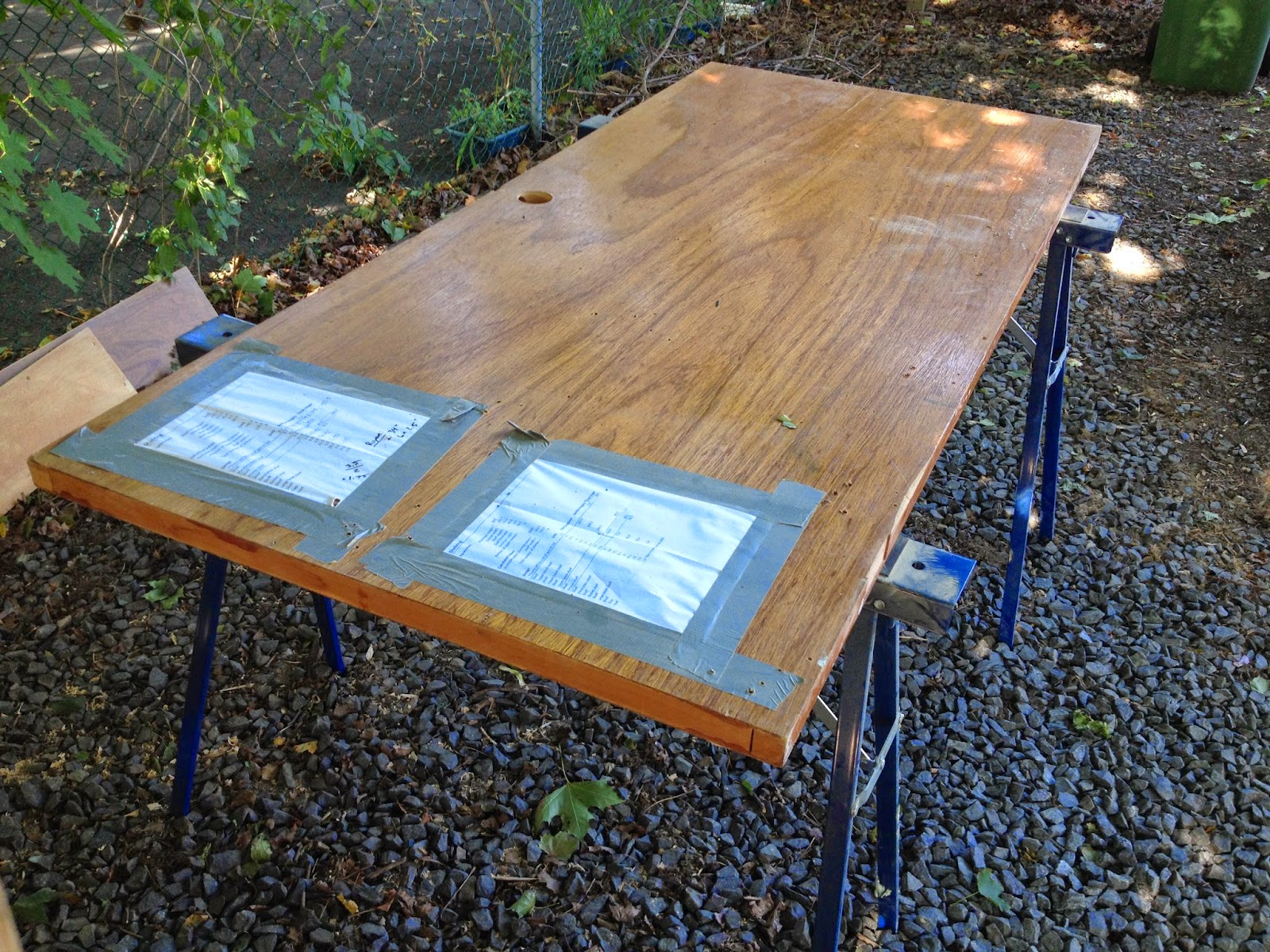 Another of the doors turned into my work bench, taped to it are the shelf spacing's: the bottom shelf needed to accommodate textbooks, the second some old wicker baskets I was using for storage, the third the stereo receiver and Xbox, and the fourth the printer. The remaining space was divided into equal parts for general use, I got lucky and it turns out my 'equal parts' are just the right height to accommodate most novels; naturally all of this was done in Excel - <3 Excel.
